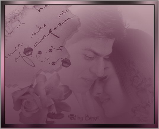 Fülle damit die Hintergrundebene. Neue Ebene erstellen - Pinselwerkzeug aktivieren. Vordergrundfarbe einen Tick dunkler wählen als die dunkle Farbe der Hintergrundebene, z.B.502239 Wähle ein schönes Brush - ein Liebespaar oder ein anderes Motiv, das gut zu Valentin passt (mein Brush: @BN_Kajol und Shah Rukh hab ich mir selbst erstellt aus einem Bild - das geht ganz einfach und schnell - Tipps dazu bekommt ihr bei Silvie gewählte Größe für mein Brush: 400) neue Ebene - weitere brushs hinzufügen - lasst Eurer Phantasie freien Lauf!- alles schön romantisch dekorieren! - immer eine neue Ebene erstellen, dann lässt sich der Pinsel verschieben, wenn er Euch an einer anderen Position besser gefällt. Und so sieht mein Zwischenergebnis aus: |